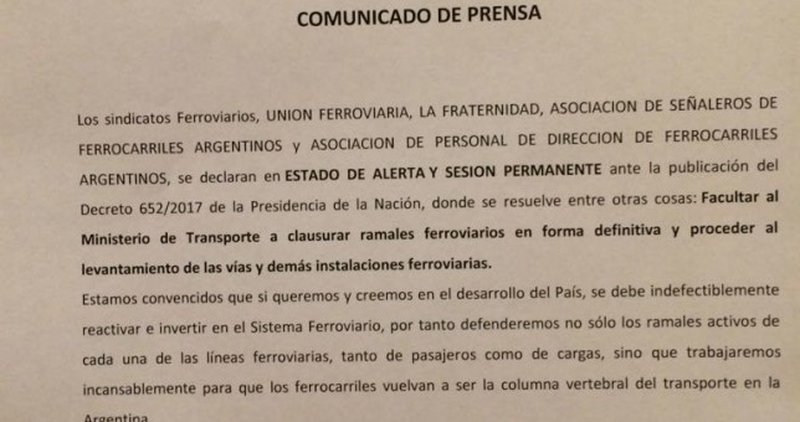 Los dirigentes de esas cuatro organizaciones sindicales Sergio Sasia (UF), Omar Maturano (La Fraternidad), Raúl Epelbaum (ASFA) y Adrián Silva (Apdfa) rechazaron el decreto 652/17, que resolvió entre otras cuestiones facultar a la cartera de Transporte nacional a “clausurar ramales ferroviarios de forma definitiva y a proceder al levantamiento de las vías y otras instalaciones”.