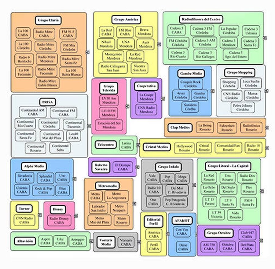 En cuanto a la estructura de propiedad, pueden ubicarse seis grandes grupos empresarios que manejan radios en Argentina. Uno de ellos es el Grupo Clarín, que cuenta con 12 frecuencias de radio en todo el país bajo su propiedad y una red de emisoras que toman contenidos de sus programaciones que supera las 200 radios. Las principales marcas de este grupo son Radio Mitre (con cabeceras en Mendoza, Córdoba y CABA) y La 100. Ambas son las radios más escuchadas en Buenos Aires. Otro grupo de gran tamaño es Radiodifusora del Centro, más conocido como Cadena 3. Como su nombre lo indica, la principal característica de esta red de radios es su presencia federal con contenidos que se producen en distintos puntos pero con la cabeza puesta en Córdoba. Con diez frecuencias propias en distintos puntos, es líder absoluto del mercado de radios cordobés con otras dos marcas además de LV3, FM Córdoba y La Popular.