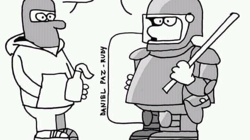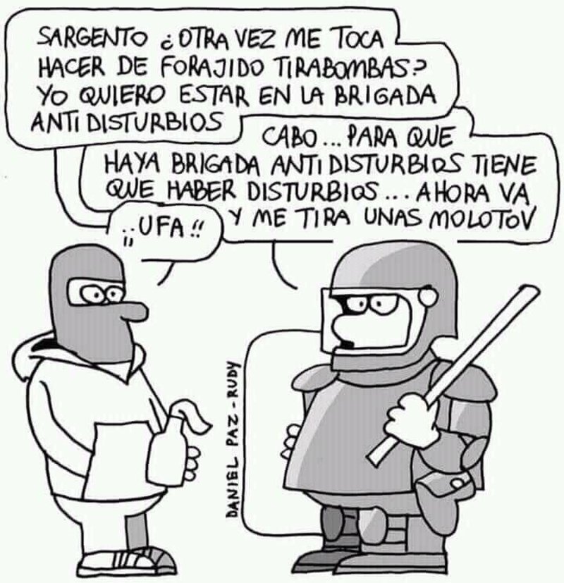 El chiste de Rudy y Paz que ilustra la nota fue publicado varios meses antes a los recientes disturbios en Congreso Nacional, sin embargo un hecho de marketinga inofensivo en apariencia, puso sobre el tapete el accionar de polícias infiltrados cuya finalidad -según se denuncia- era “investigar” a los manifestantes y a la vez tener acciones de agitación que pudieran arrastrar a algunos violentos y así desacreditar la movilización de casi 500 mil trabajadores contra la reforma previsional y a la vez desviar la mirada de la población sobre lo que ocurrió en la sesión de diputados.