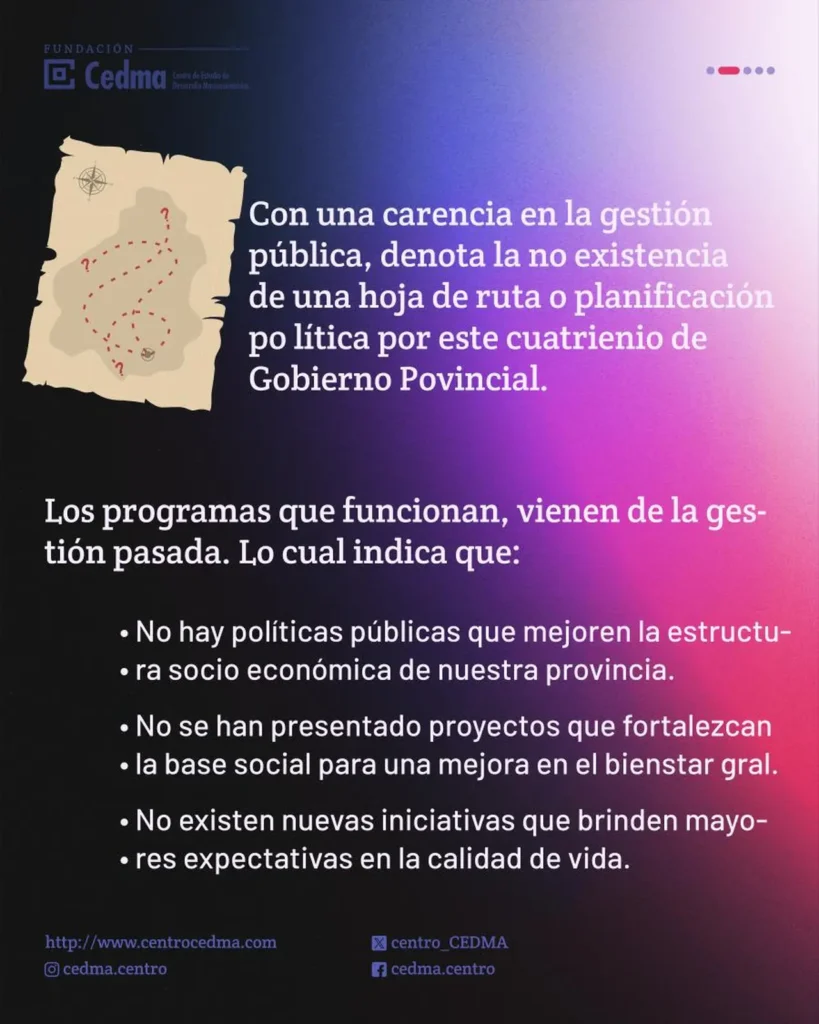 Desde el inicio de mandato hasta la fecha, la nueva administración de Gobierno, se ha caracterizado por la carencia en la gestión pública. No se conocen los ejes o vectores que darían sustento a las políticas públicas de dicho gobierno. Es decir, no existe una hoja de ruta o planificación política por este cuatrienio de Gobernación Provincial. La gestión parece estar a la deriva, navega por la misma fuerza de inercia.