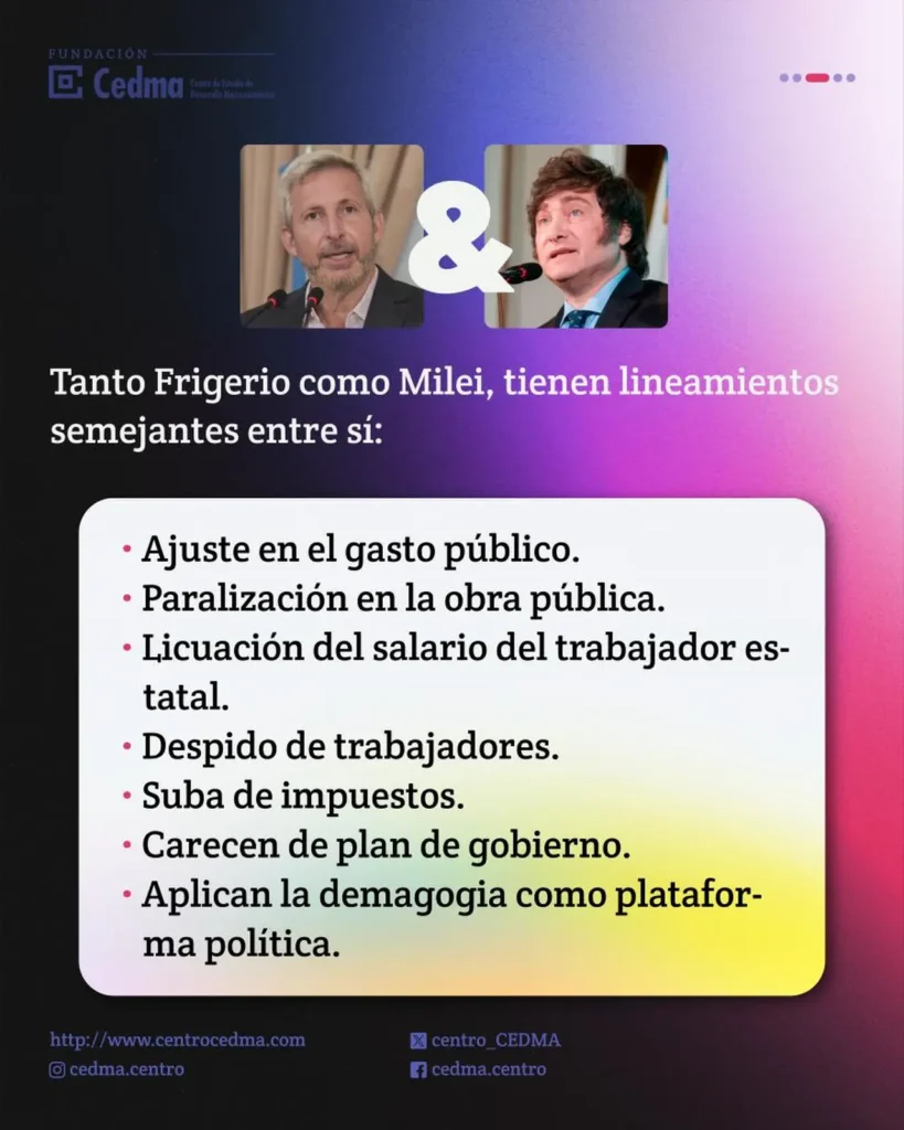 En efecto, se puede deducir que, los lineamientos principales de Frigerio, se asemejan a los de Milei. El proceso y el tiempo para llegar a dichos objetivos es el mismo. Ambos implementaron un ajuste significativo en el gasto público, ambos paralizaron la obra pública, ambos licuaron el salario del trabajador estatal, ambos despidieron trabajadores, ambos subieron impuestos, ambos carecen de plan de gobierno, ambos aplican la demagogia como plataforma política.
