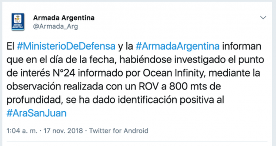 La Armada publicó cerca de la medianoche un escueto comunicado donde se daba cuenta del encuentro del buque. “El Ministerio de Defensa y la Armada Argentina informan que en el día de la fecha habiéndose investigado el (Punto Dato) POI 24 informado por la empresa Ocean Infinity, mediante la observación realizada con un ROV (vehículo de observación remota) a 800 metros de profundidad, se ha dado identificación positiva al submarino ARA ‘San Juan'”.