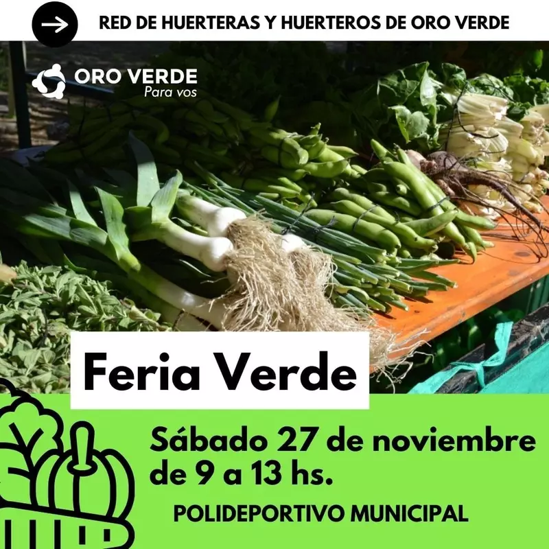 El sábado 27 de noviembre se realizará una nueva Feria Verde. Impulsada por la Red de Huerteros y Huerteras de Oro Verde y el Municipio, tendrá lugar en el sector cercano a las parrillas del polideportivo municipal en el horario habitual de 9 a 13 horas.