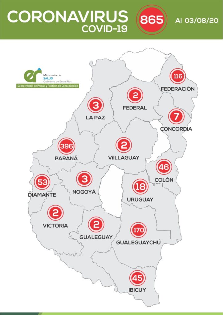 Asimismo, dos de los confirmados corresponden a la localidad de General Ramírez, departamento Diamante, y están relacionados con casos confirmados previamente de Covid-19.