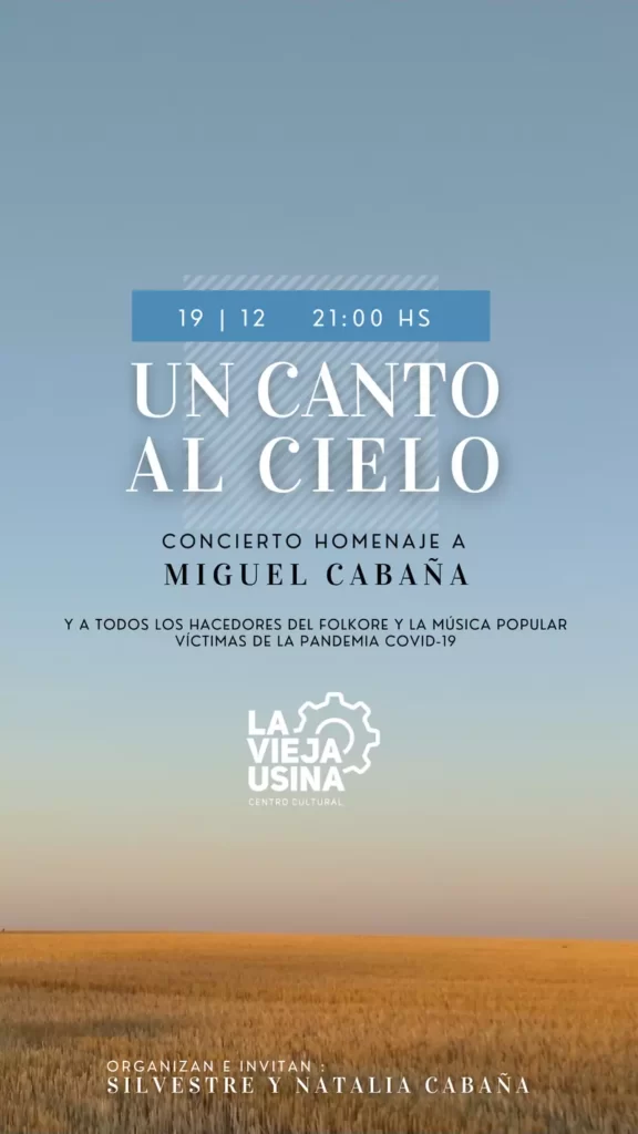 Un canto al cielo, es el nombre que recibe el concierto homenaje que Silvestre Cabaña, ofrecerá para su padre Miguel Cabaña y otros amigos y hacedores de la música popular víctimas de la pandemia Covid-19. Será el 19 de diciembre a las 21:00 en el Centro Cultural La Vieja Usina de la ciudad de Paraná.