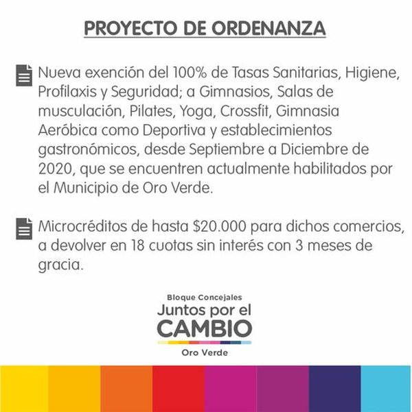 En la mañana del 8 de setiembre, el Bloque de Concejales de Juntos por el Cambio de Oro Verde dio a conocer en redes y medios “un resumen del proyecto de ordenanza presentado hoy en el HCD que busca continuar con el apoyo tributario municipal y un microcrédito a gimnasios como actividades gastronómicas de nuestra ciudad.”