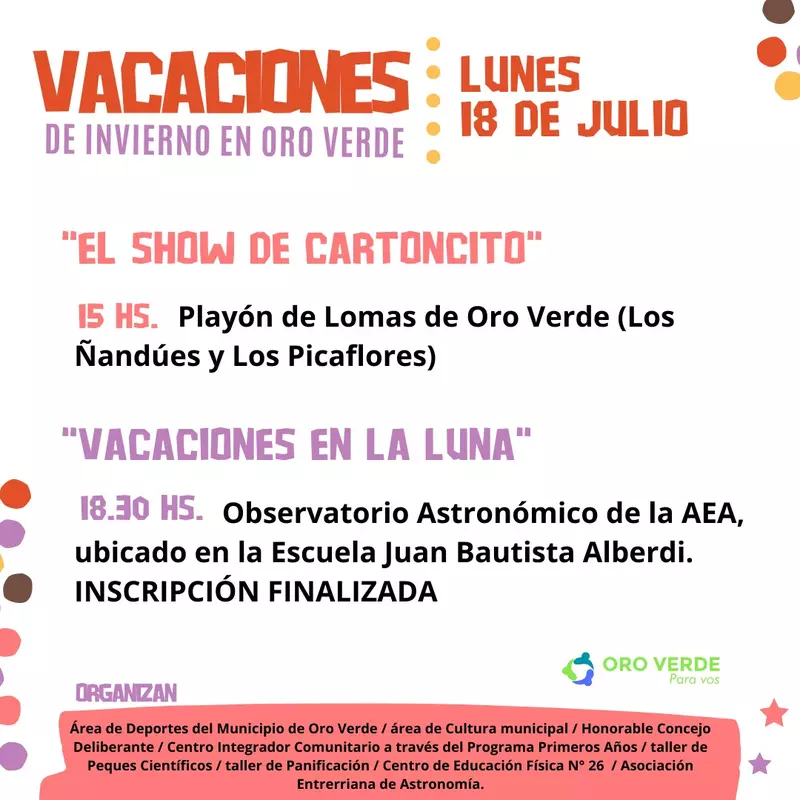 Además a las 18:30 hs se llevará adelante la actividad Vacaciones en Luna, en el Observatorio Astronómico.